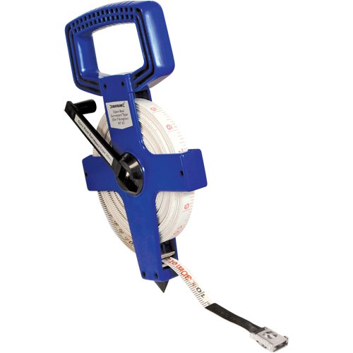 Mètre d'arpenteur robuste à ruban en fibres. Graduations métriques et impériales. Châssis en plastique résistant à manivelle repliable.